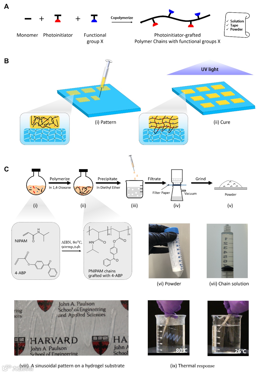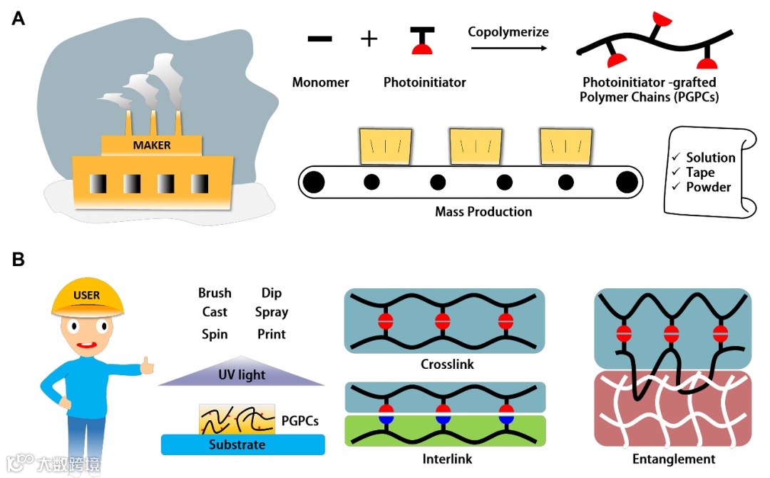 图1:光引发剂接枝的聚合物链将水凝胶漆的制作者和使用者两种劳动力分开。
