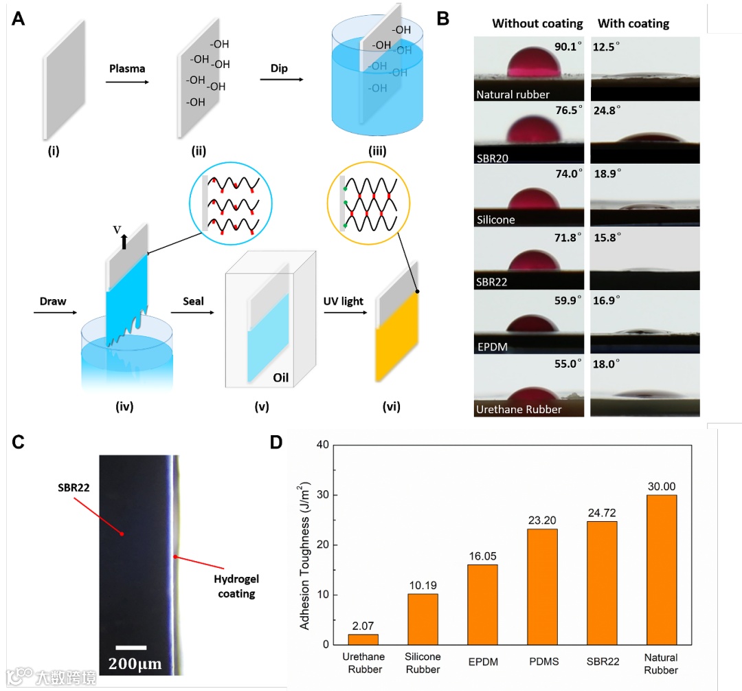 在第二个应用中,PGPCs被涂覆在疏水的非渗透基底上,以形成亲水涂层。研究人员将弹性体浸蘸入PGPCs溶液后使用恒定速率将弹性体从PGPCs溶液中提出,并在紫外光灯下固化样品(图4A)。实验中使用了多种弹性体,包括天然橡胶、丁苯橡胶(SBR)、硅橡胶、乙丙二烯单体橡胶 (EPDM)、以及聚氨酯橡胶。当紫外光灯照射时,分子链上的二苯甲酮基团在分子链上产生自由基。也可能在基底材料中产生自由基。当两个自由基相遇时,两个聚合物链之间形成交联,聚合物和基底材料之间形成粘接。水滴在裸露的基底材料表面的接触角大于55°,而在有水凝胶涂层的基底上的接触角小于20°(图4B)。显微镜下的照片展示了SBR橡胶上的水凝胶涂层的厚度,大概为 50 μm (图4C)。水凝胶涂层和不同基底之间的粘接韧性由90度剥离实验表征(图4D)。