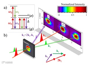 中心对称材料中的最低阶非线性是χ(3),它描述了响应的一部分,即驱动光束振幅中的第三阶。它负责诸如简并四波混频(DFWM)之类的效应,其中所有四个光子具有相同的能量,两个被激发,另两个则被发射,见图1。从调制器到量子中继器,充分简并(或近简并)FWM响应是将介质应用于有源光学系统的先决条件。