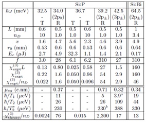 如图1所示,研究者们使用来自自由电子激光器FELIX的太赫兹脉冲进行了非共线DFWM实验,在10K时,Si:P和Si:Bi的1s→2p跃迁发生了共振和非共振。实验上,三阶非线性通过测量临界脉冲能量得到,与理论上利用两能级模型计算的一致。表1列出了两种掺杂在共振和非共振情况下的三阶极化率。