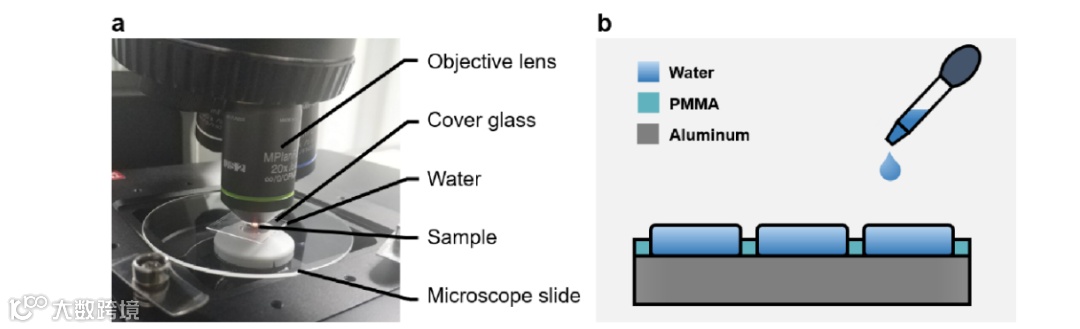 图3. (a)显微实验测试示意图和(b)选择性浸润示意图
