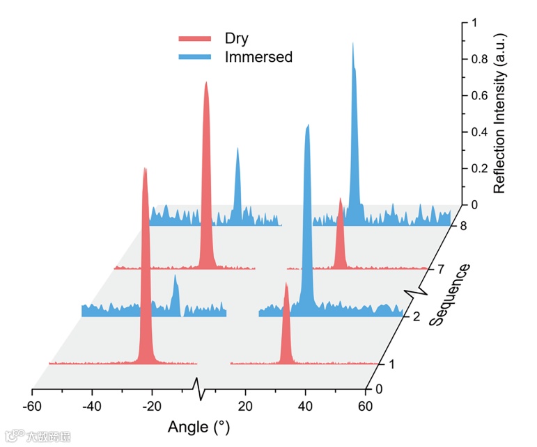 该超表面由下层亲水金属材料基底(铝)和上层含梯形槽孔阵列的疏水介质膜(PMMA)组成(见图2),其单元结构为PMMA膜上宽度渐变的梯形空气槽孔。不同于以往的液浸调控思路,该研究提出了一种由材料间亲疏水性差异造成的水在超表面上选择性浸润的结构假设。具体而言,设计的超表面结构采用亲水基底和含梯形空气槽孔的疏水层构成,当样品浸润时,水更易在梯形槽中聚集,从而形成选择性浸润,使超表面上的光学相位梯度会发生改变(见图3)。基于此调控设想,该研究进行了理论仿真和实验测量。其实验与仿真结果一致表明,干燥和浸润情况对应的远场反射角度发生了反转(见图4),并具有较好的级次对比度。此外,该研究还进一步通过循环性实验对样品的调控功能进行了重复性验证(见图5)。