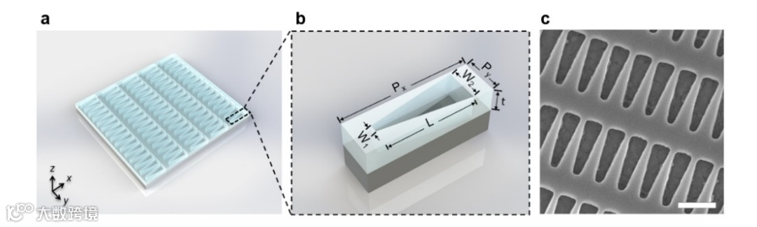 图2. (a)梯形槽孔阵列示意图;(b)单元结构示意图;(c)梯形阵列的扫描电镜图,标尺对应500 nm