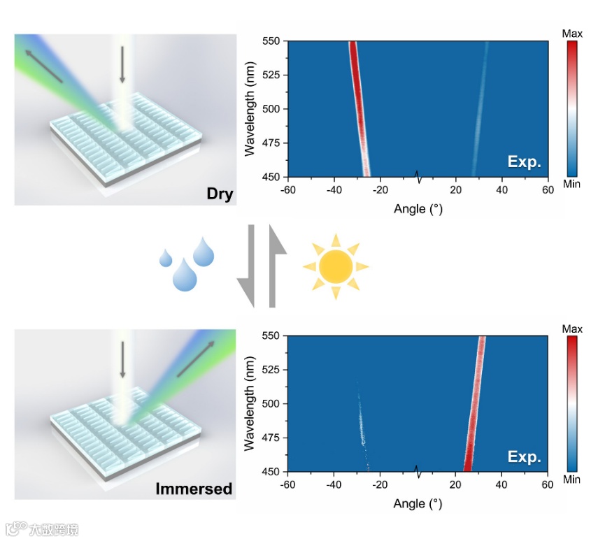 研究团队对基于亲疏水超表面的浸润式主动光束操控进行了研究,可实现在干燥或浸润情况下对光束偏折反转的主动控制。
