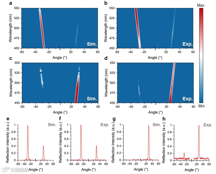 图4. 两种环境下的远场反射分布。(a, b, e, f)对应干燥情况;(c, d, g, h)对应浸润情况。(e, f, g, h)入射波长475 nm时的反射强度线图