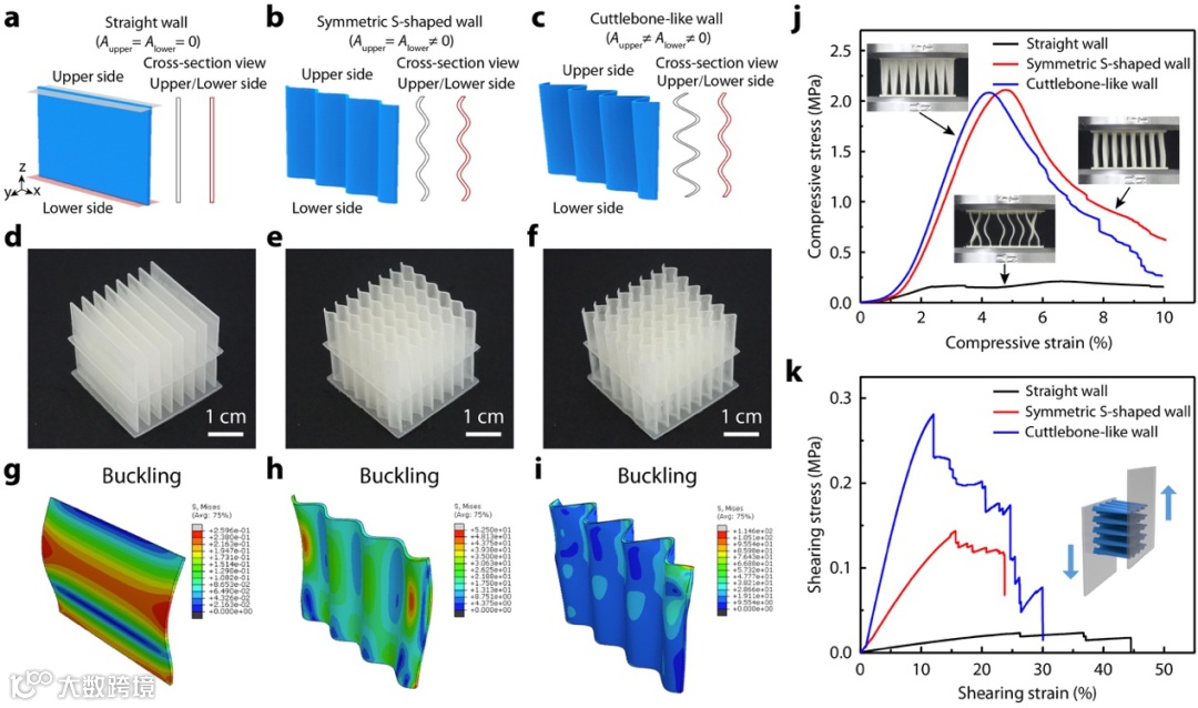 图2:仿生模型的制备、测试及模拟。(a-c) CAD设计的仿生模型;(d-f)3D打印模型的光学图;(g-i) 仿生模型的有限元模拟;(j, k) 压缩与剪切测试结果。