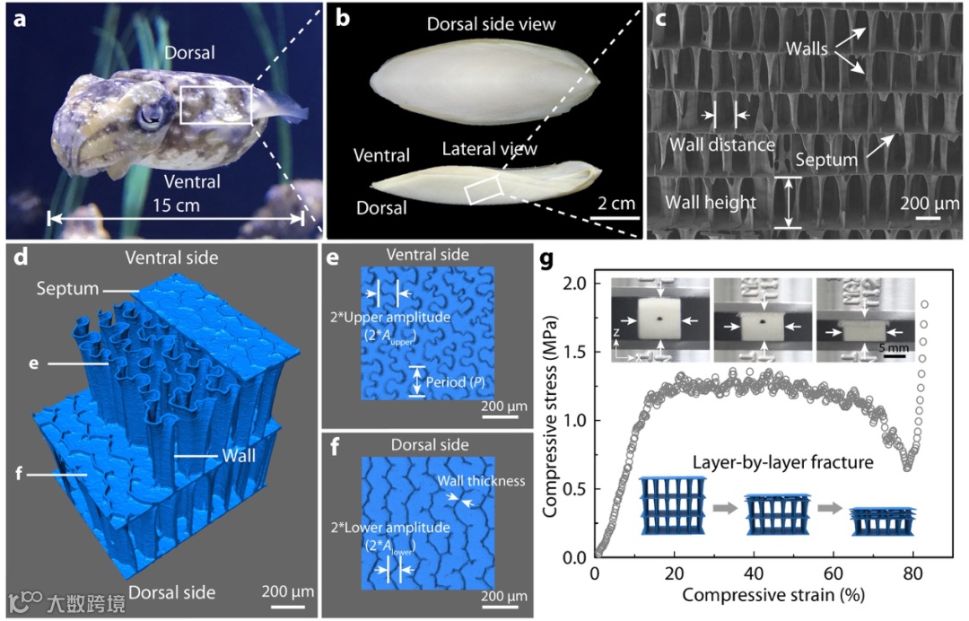 图1:天然墨鱼骨的结构与力学性能。(a, b) 天然墨鱼及墨鱼骨光学照片;(c) SEM照片显示天然墨鱼骨为层状多孔结构,层间由均匀分布的墙壁隔开;(d) 由micro-CT图像重建的天然墨鱼骨的三维结构,显示平行的层板由不对称的s形波浪壁支撑;(e-f) 腹部侧和脊背侧的横截面显示出墙壁的不对称性;(g) 墨鱼骨的压缩曲线显示出长平台期,层层断裂机制使其具有零泊松比和高能量吸收性能。