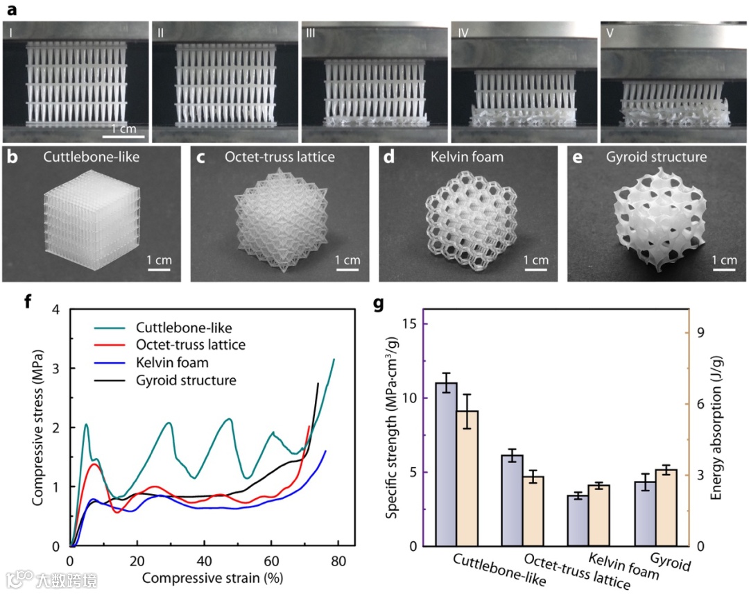 图3:仿墨鱼骨结构多孔材料与其他多孔材料的对比。(a) 3D打印多层仿墨鱼骨结构材料的压缩测试光学图;(b-e) 3D打印仿墨鱼骨材料与其他点阵多孔材料光学照片;(f) 四种结构的压缩应力-应变曲线对比;(g)比强度和能量吸收性能对比。