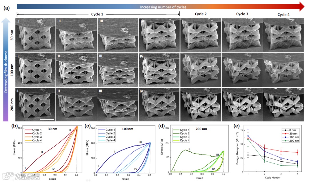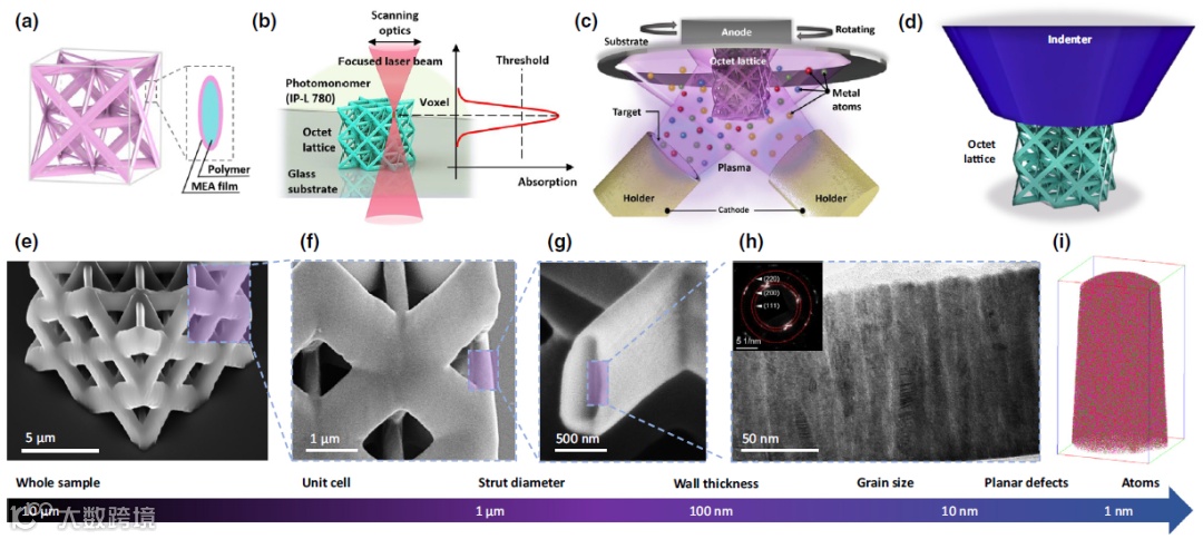 作者首先利用高精度微纳尺度光固化3D打印机制造出三维聚合物微点阵模板,通过磁控共溅射的方法,在聚合物表面沉积上一层厚度为30, 100和200nm的中熵合金薄膜,加以比较分析,以及优化,最终制备出一种最优的新型多级金属复合微点阵力学超材料。