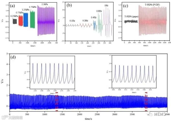 T-FPE的传感性能。(a) 不同压力(0.25-2.5kPa)下的压电输出电压。(b) T-FPES在2.5kpa不同频率(0.1-1hz)压力下的输出电压。(c)不同压电层的输出电压。(d) T-PEPS在2000个工作循环下的传感稳定性试验。