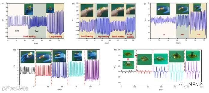 压电传感器的应用演示。(a) T-PEPS在小/大弯曲位置产生的输出电压,插图分别显示了T-PEPS在小/大弯曲位置的照片。(b) 手腕在不同弯曲度下的输出电压。(c) 手指弯曲和拉伸分别为5°、30°和60°时的输出电压。(d) 不同手指的输出电压。(e) 监测不同物体时传感器的输出电压。