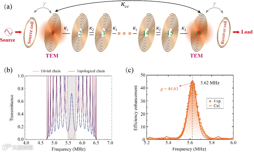 该研究以磁共振线圈作为结构单元,基于近场耦合的紧束缚模型,设计了具有PT对称的非厄米拓扑结构,并将拓扑链中的拓扑边界模式应用于远程的WPT(如图1)。由于拓扑边界态具有拓扑保护特性,所以其实现的远程WPT对结构的内部扰动和构造误差具有很好的鲁棒性。