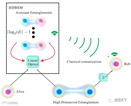 为了实现高维量子通信,李传锋、柳必恒等人从2016年开始采用光子的路径自由度编码,解决了路径比特的相干性问题[PRL 117, 220402 (2016)],制备出了高保真度的三维纠缠态[PRL 117, 170403(2016)];解决路径维度扩展问题,实现了32维量子纠缠态[PRL 125, 080503 (2020)];解决路径自由度的传输问题,实现了高维量子纠缠态在11公里光纤中的有效传输[Optica 7, 738 (2020)]等。研究组从2017年起开始了高维量子隐形传态的实验研究。然而理论研究表明,在线性光学体系中,必须采用辅助粒子才能实现高维量子隐形传态。