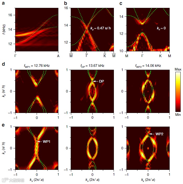 图2 (a-d) 三维狄拉克声子晶体与(e) 外尔声子晶体的体能带测量结果
