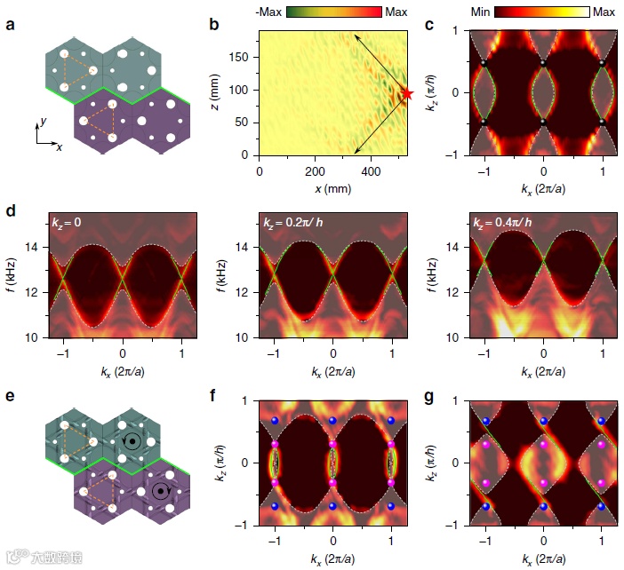实验通过测量声场分布并进行傅里叶变换得出了声子晶体的能带特性。图2展示了三维狄拉克声子晶体与外尔声子晶体的体能带特征。狄拉克锥具有沿一个方向强烈倾斜的特征,而在外尔声子晶体中,每个狄拉克点退化为一对有不同频率和动量的外尔点。