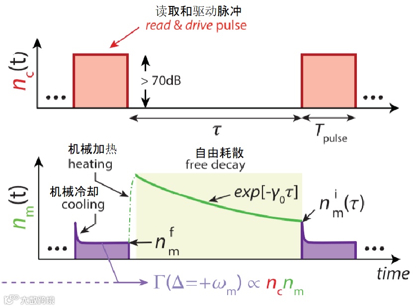 进一步,研究人员在实验中使用振铃方法(ringdown measurement)测量了这种具有声学屏障的OMC谐振器的能量阻尼和品质因数,对系统作用一小段时间的激励,然后允许系统自由衰减,在衰减末尾再次对系统进行测量,得到能量阻尼和品质因数的相应值。如图3所示,单脉冲激光同时执行了对系统呼吸模式的激励和读出。