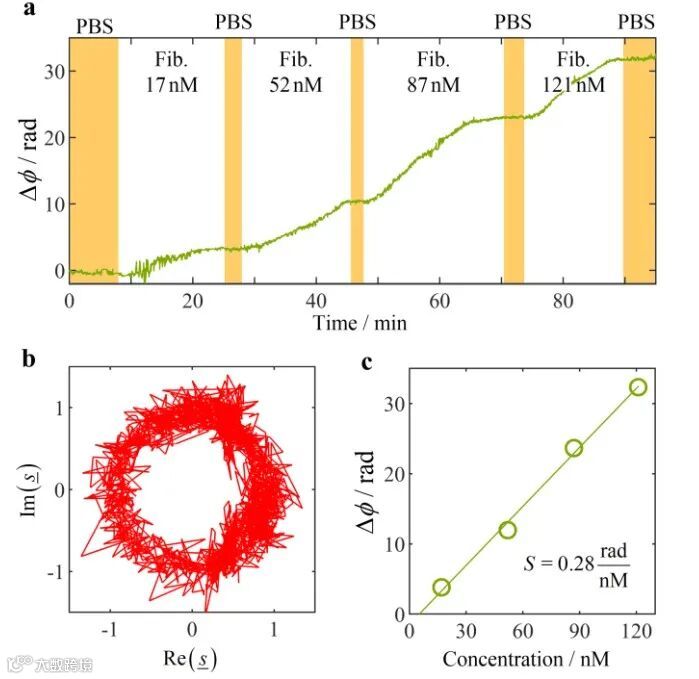 图3 使用SiNOH激光作为光源的传感器,该传感器用于检测溶解在磷酸盐缓冲盐水(PBS)中的纤维蛋白原的演示。