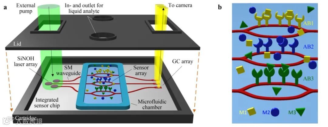 近日,来自德国的科学家们Daria Kohler, Christian Koos等人发表了题为“Biophotonic sensors with integrated Si3N4-organic hybrid (SiNOH) lasers for point-of-care diagnostics”的高水平论文。低成本的护理点设备对疾病进行早期有效诊断这对个性化医疗和公共卫生保护越来越重要。氮化硅(Si3N4)平台上基于波导的光学生物传感器是一个特别有前景的选择,它可以对在多路复用传感器阵列中的指示性生物标记物提供高灵敏度的检测(可见光波段)。虽然基于无源Si3N4的光子电路可实现大规模生产,但低成本光源的集成仍然是一个挑战。该文章演示了将Si3N4传感器电路与混合片上有机激光器结合在一起的光学生物传感器,见图1,这是由共集成低成本有机光源驱动的集成光学电路的首次演示。该文章发表在《Light: Science & Applications》期刊上。