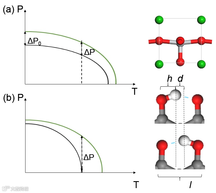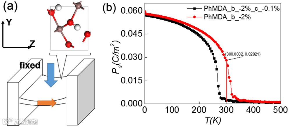 而许多氢键铁电体的居里温度在200-400K,有望满足这两个条件,从而成为理想候选者。例如,有机铁电体PHMDA和[H-55DMBP][Hia]的居里温度分别为363K和268K。更进一步,氢键的力学特性使得材料在外力作用下很容易压缩或拉伸,而且质子跃迁势垒以及居里温度都会随应变而显著改变。这一特性给调控带来极大便利(下图1b)。
