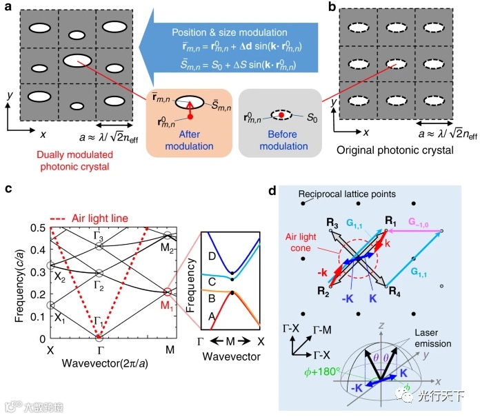 光子晶体激光器是一种“半导体激光器”,它的晶格点可以看作是纳米级的天线,通过排列可以使激光束从表面垂直发射。但最初光束只能在二维平面上朝一个方向前进,团队需要覆盖更多的区域。周期性地排列天线位置,成功地改变了方向,但功率输出的下降和变形的形状使这一解决方案不可行。