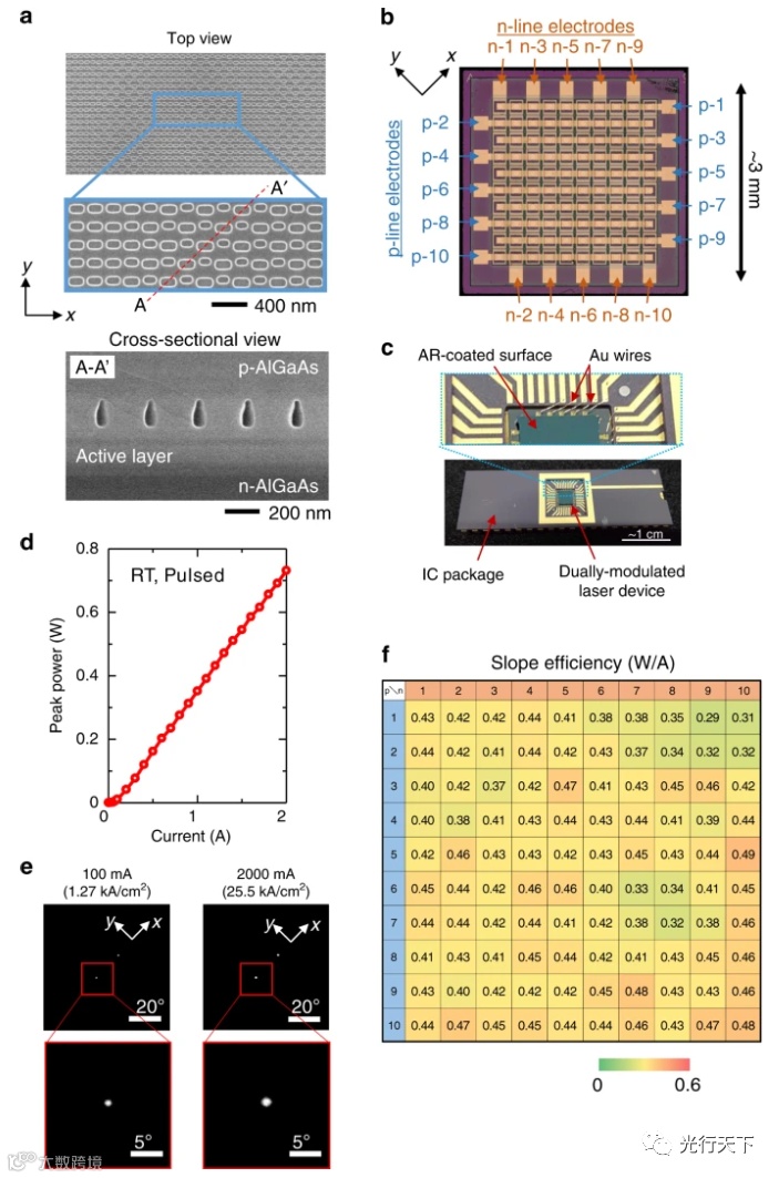图2. 片上双调制光子晶体激光阵列的制造和表征