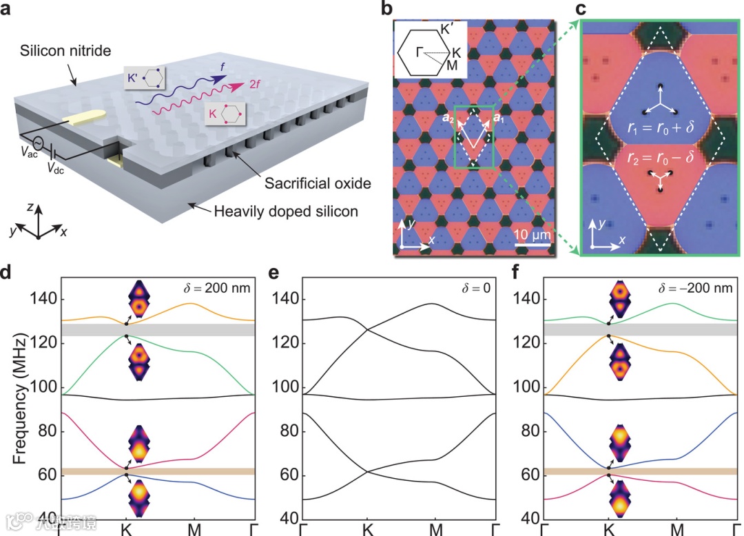 支持超声弹性波的集成声子电路得到越来越多的关注,不仅在处理射频信号方面具有优势,而且在实现与光和物质更强的相互作用方面也具有优势。纳米机电系统是集成声子电路的理想平台,因为非常高频率(VHF)的弹性波可以在单个芯片上产生、操纵和检测。包括低损耗波导和高质量谐振器在内的各种元件已被实验证明。然而,在纳米机电系统中,抑制弹性波的反向散射被认为是一个巨大的挑战。受凝聚态物理中发现拓扑绝缘体的启发,拓扑边缘状态现在被认为是克服这一挑战的有前途的策略。最近,通过模仿众所周知的量子自旋霍尔(QSH)效应,声子拓扑绝缘体已经在纳米-机电平台上实验实现。谷赝自旋已成为凝聚态物理中实现后向散射免疫的另一种方法。在光学领域,基于纳米光子晶体的量子谷霍尔效应(QVH)拓扑绝缘体已被实验实现,其应用领域包括拓扑波导、纳米光子激光器、拓扑量子腔电动力学等。另一方面,声子QVH拓扑绝缘体的实验实现仅限于在相对低频率(<1.5 MHz)下工作的整体声学和机械系统。迄今为止,尽管有理论上的预测,但在VHF集成纳米机电平台上的声子QVH拓扑绝缘体的实验仍不可实现。而且,现有的声子QVH拓扑绝缘体大多只能在单一频段工作,不能用于多频段通信、多频段滤波器、多频段亚波长谐振器等多频段应用。对于大规模的多功能拓扑声子电路,在理论上已经提出了多波段声子QVH拓扑绝缘体,但在纳米机电系统中还有待实验证明。