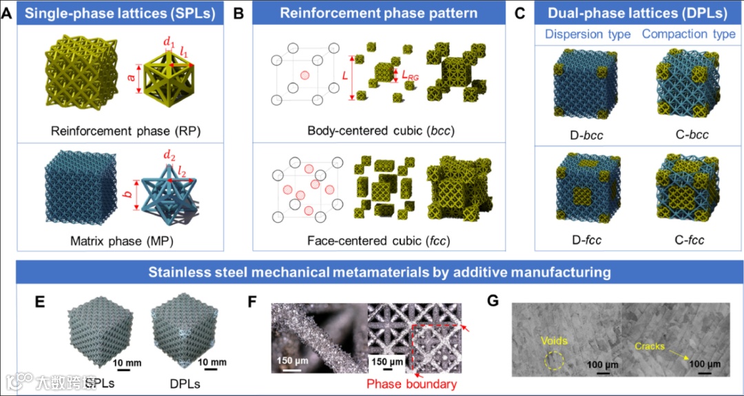 近日,北京航空航天大学交通科学与工程学院殷莎副教授和美国加州大学伯克利分校材料科学与工程系Robert O. Ritchie教授受生物材料和工程合金中观察到的沉淀强化机制的启发,开发了双相力学复合超材料,采用结构晶格材料作为组成基体和增强相。采用选择性激光熔化增材制造技术,可以简单地制造由奥氏体不锈钢制成的复合超材料。通过准静态压缩试验和模拟研究,发现增强相晶粒的加入可以同时提高材料的强度和韧性。研究了增强相图案化和连通性的影响。通过充分利用相边界滑移的能量耗散,优化设计了最大滑移面积的双相超材料,使基体相的每个桁架单元完全被强化相格所包围。这种材料的比能量吸收能力是矩阵相晶格的2.5倍。分析并总结了耗散双相超材料的设计原理,重点介绍了相图的设计。当前的数字多相力学超材料可以模仿自然界的几乎任何结构和增韧机制,从而提供了一种通过任意相材料选择和图案化来操纵机械性能的新途径,这会显着扩大未来材料开发的设计空间。相关研究发表在固体力学顶级期刊《Journal of the Mechanics and Physics of Solids》上。(徐锐)