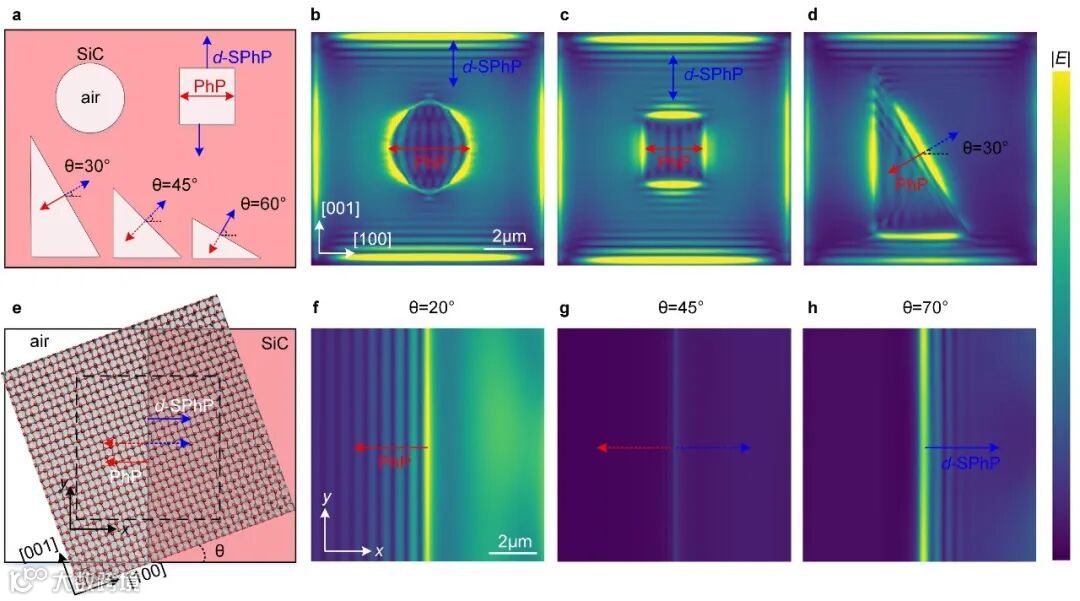 研究人员通过将α-MoO3置于不同纳米图案的SiC谐振腔之上,实现了单向的双曲极化激元激发,如图3所示。针对圆形谐振腔,腔内部所有允许的PhP模式激发形成扁桃仁状的模场分布(图3b);针对正方形谐振腔,腔内部PhP条纹沿[100]方向传播,外部d-SPhP条纹沿[001]方向传播(图3c);针对三角形谐振腔,当斜边θ= 30°时,仅腔内部出现单向的PhP条纹(图3d)。同样,科研工作人员预测可以通过控制α-MoO3和边缘之间的夹角来操纵单向传输(图3e),例如当θ < θopen时,单向PhP沿左侧传播(图3f);θ ~θopen时,两侧均无极化激元条纹(图3g);当θ > θopen时,单向d-SPhP沿右侧传播(图3h)。因此α-MoO3/SiC纳米谐振腔提供了全新的方式来操控和实现单向的极化激元。