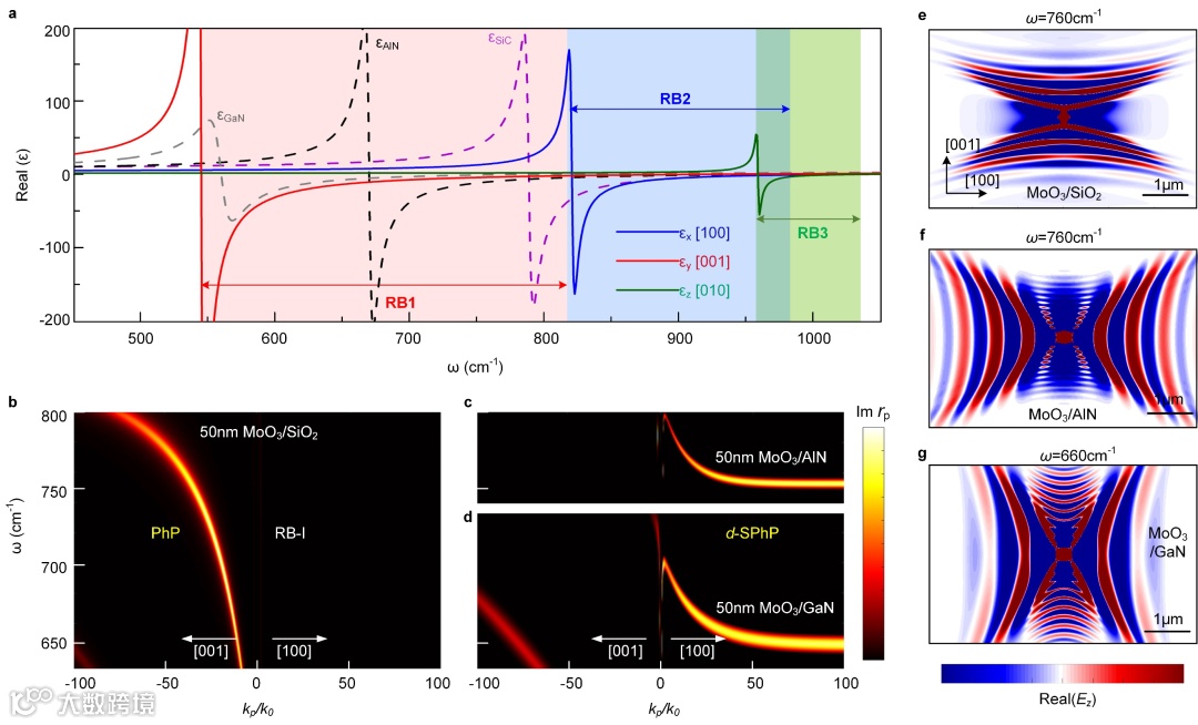 研究人员指出以上各项异性模式杂化耦合的双曲色散重构方法不仅限于α-MoO3/SiC异质结,可以拓展至其它的频率范围,或应用于其他各项异性材料和体块的极性介质组成的混合系统中。如图4a所示,极性材料AlN和GaN,在α-MoO3的RB-I波段(600-800 cm-1)具有重叠的声子响应,值得注意的是在RB-I波段,α-MoO3的介电常数沿[001]方向为负,导致支持的双曲PhP色散也沿[001]方向(图4b)。因此通过将衬底换成这该波段的以上两种极性介质,双曲色散翻转到[100]方向,模拟预测了类似的双曲色散重构现象(图4c-g)。此外,通过选择其他各向异性范德华材料(如α-V2O5),该异质结构界面的概念将适用于更多的频率范围。