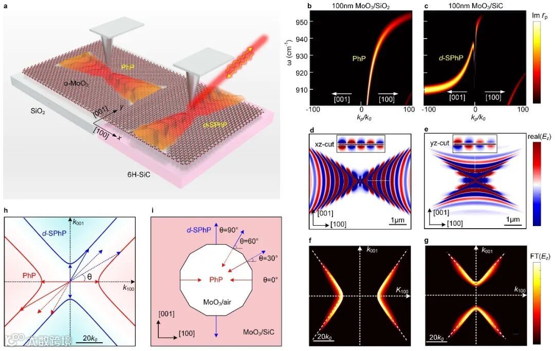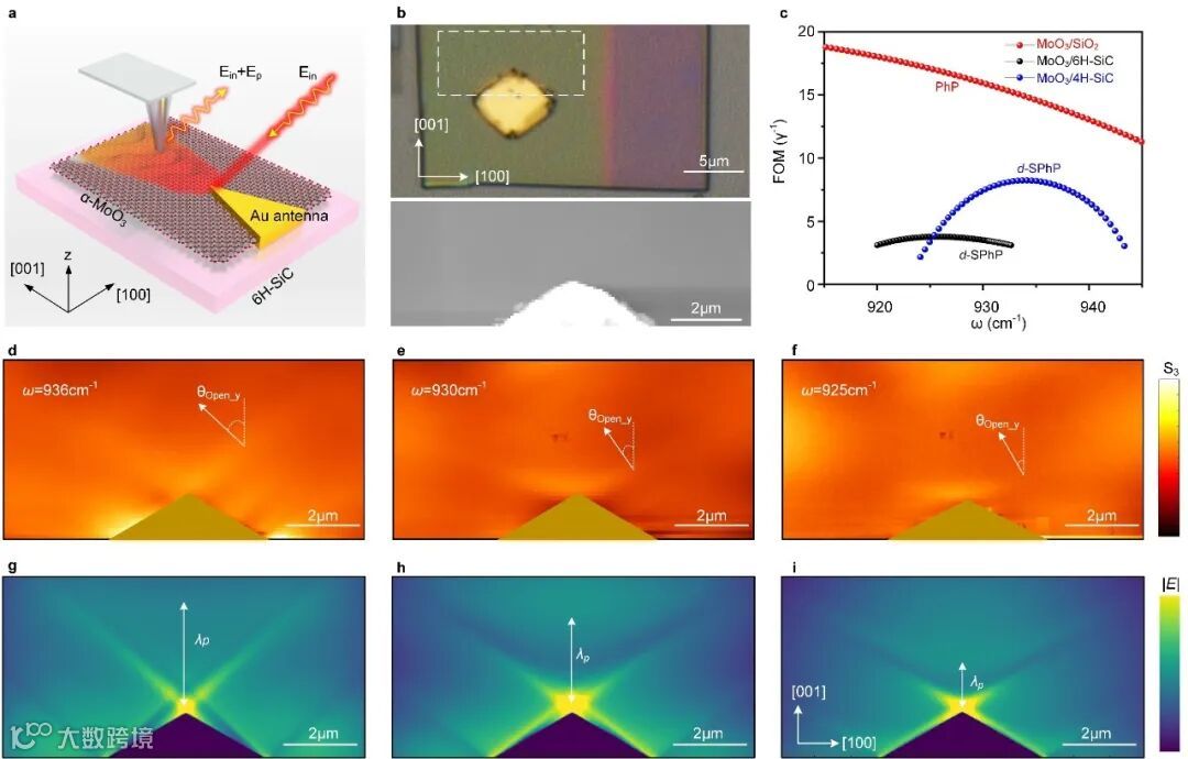 研究人员利用实空间的近场光学成像技术对d-SPhPs的传播条纹进行了观测,如图2所示。通过在α-MoO3上表面加工金属天线,天线的尖端激发d-SPhPs模式,并通过扫描近场光学显微镜的针尖接收信号获得传播条纹分布。可以看到,在天线的[001]顶端出现了清晰的双曲信号(图2d-f)。由于该d-SPhP模式的品质因子较低(图2c),导致在实验上只观测到一个条纹。通过理论预测,研究人员发现可以通过改变衬底来获得更高品质因子,例如使用4H-SiC衬底,计算得到的品质因子可以超过9(图2c)。