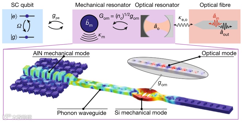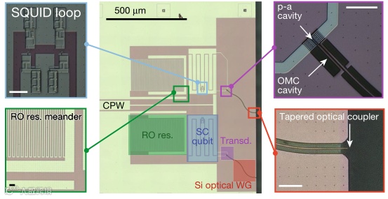 令人更加兴奋的是,该实现过程全都是在芯片尺寸大小的平台上完成的。该平台将传输子(transmon)与压电-光机械(piezo-optomechanical)转换器集成在一起。