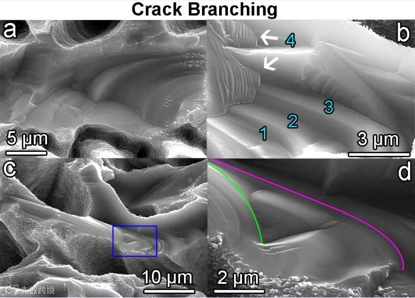 碎裂路径和生成的微米碎屑 通过对部分碎裂沟槽侧壁的分析,研究人员揭示了沟槽的碎裂路径和产生碎裂的原因。图 8a-i表明纳米尺度和微米尺度的缺陷充斥着沟槽的侧壁,裂痕会在脱离碎屑的边缘指向性延伸。大量的碎屑脱离会产生大面积的裂痕,这些裂痕会相互交织覆盖整个侧壁,在冲击波的作用下便会导致大面积的块体脱离,最长能达到约40微米,如图 8j-r所示。碎屑的弧度边缘表明了碎裂的曲向传播。大面积碎裂的表面还存在一些其他碎裂痕纹(图8j-l),表明同一个沟槽的碎裂可能经历一系列连续的“冲击-脱离”事件,局部的小面积碎屑首先脱离,随后发生大面积碎屑脱离。