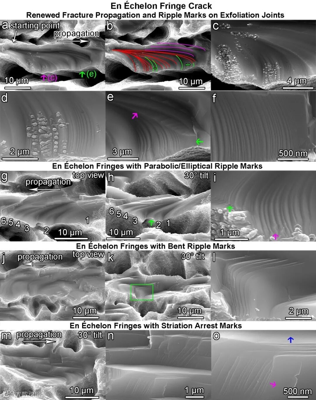 En échelon 微纹痕及纳米抛物线状纹痕 图4展现了典型的en échelon微纹痕及其纳米抛物线状纹痕。碎裂起始于沟槽的一个角落(图4a),然后沿着平行沟槽的方向传输。在碎裂传输的过程中,裂纹的强度和方向会不断变化,产生一系列en échelon微纹痕及其纳米抛物线状纹痕。碎裂纹痕可分为三种典型的结构,如图4b三种不同颜色所表示。红色标识勾画了一系列始于碎裂起始点(starting point)的en échelon微纹痕,在其间分布着大面积的纳米抛物线状纹痕(绿色标识区域),如图4d-f所示。粉色标识表明纵向碎裂传播会形成一系列抛物线型台阶状结构,在图4m更明显。在每层台阶上,会分布着一系列不同取向的纳米结构(图4n-o),表明碎裂可以在不同维度同时传播。图4g-h和图4j-k显示裂纹倾向于先向下传输然后再向顶端传输,形成多达6层深度逐步递减的抛物线型微米台阶结构(图4h)和数层“弧形”纳米纹痕(图4l)。在高度非突变(高度突变如图4n)的微米台阶结构上会生成大面积纳米抛物线状纹痕(图4h-i),表明大尺度碎裂传播过程中伴随着一系列纳米尺度的碎裂波前震动。图4c-d表明许多纳米纹痕演变成HSFLs或珍珠状纳米颗粒,此现象将在图9详细表征和分析。