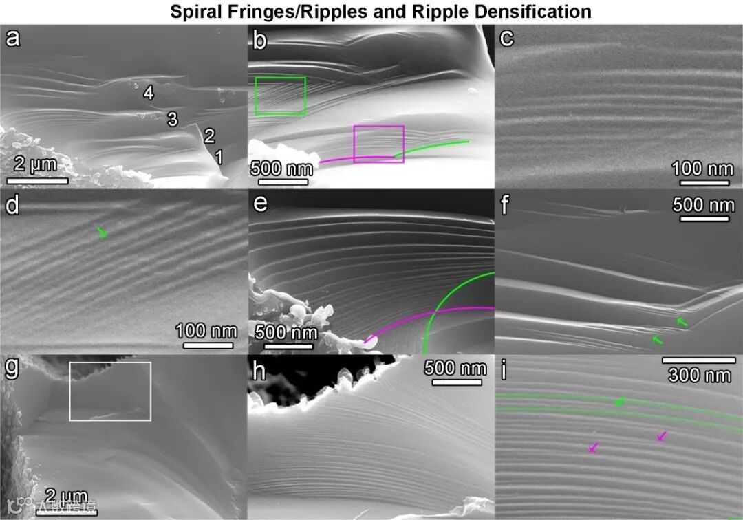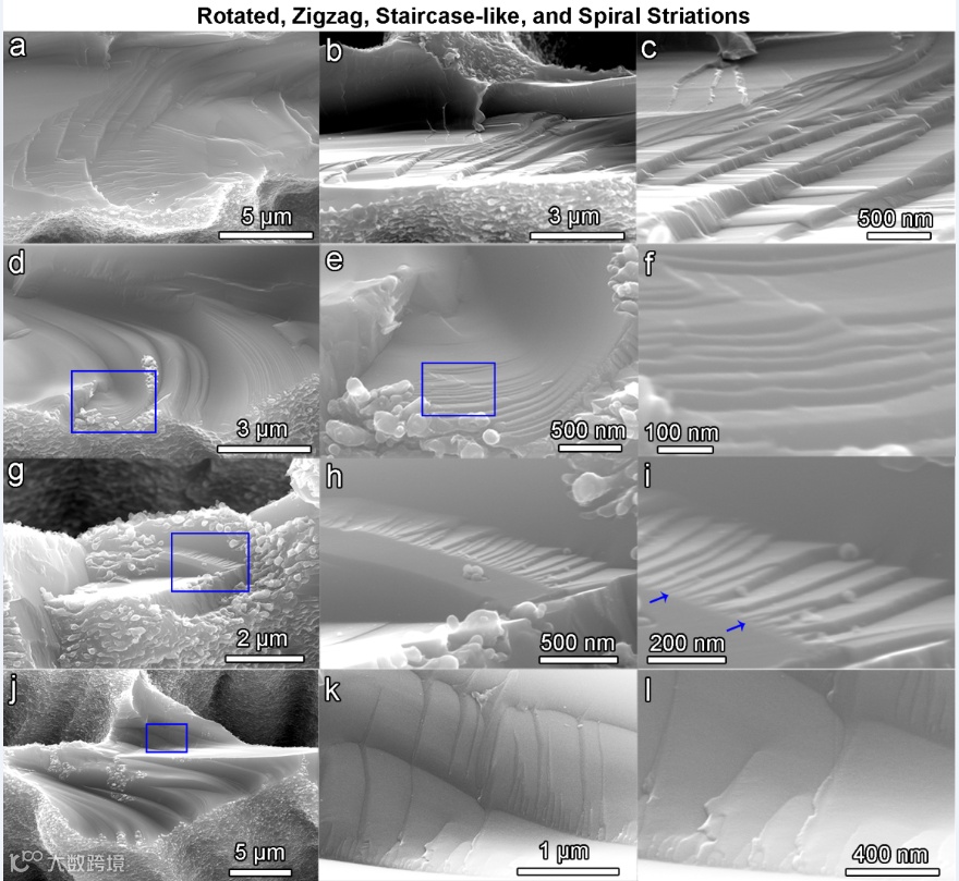 纳米纹痕阵列及其密度增强 图6a-f展现了连续4次螺旋状en échelon微碎裂所生成的一系列纳米纹痕,纳米纹痕的高度由下向上逐渐递增(图6e)。图6b和6e不同颜色的线条标识了不同方向的纳米纹痕,表明了纳米纹痕的产生可以来自沟槽内部和沟槽外部。图6d和6g-i展现了两端同时碎裂引起的纳米纹在绿色箭头和粉色箭头区域交叠可以增强纳米纹痕阵列密度的现象。图6表明通过控制同一界面两端碎裂可以实现纳米纹痕密度增强,通过控制碎裂引发点和碎裂强度还可以实现纳米纹痕的交错。