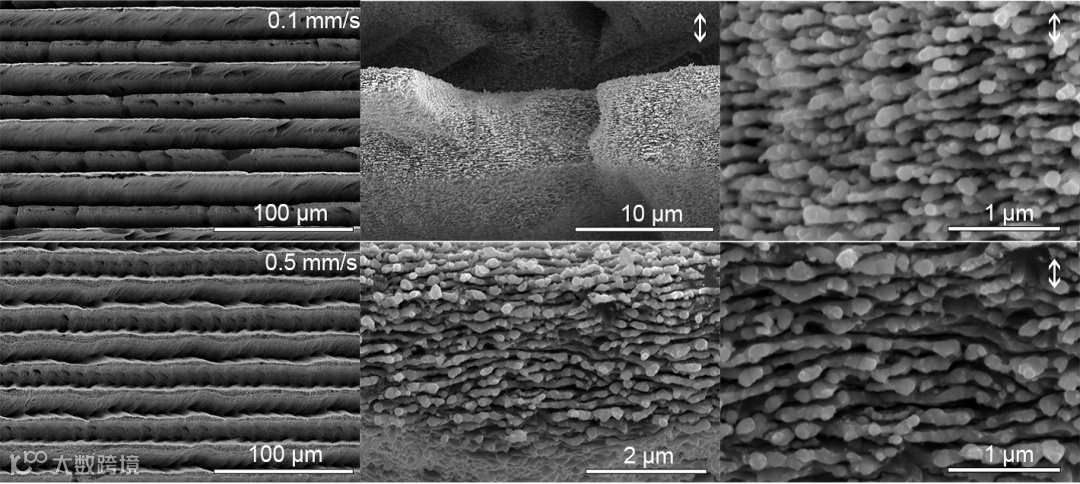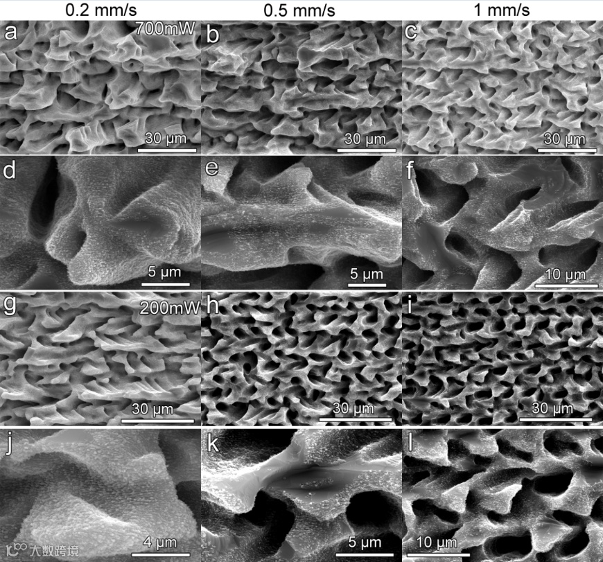碎裂微纳结构俯视图和侧视图 图3展示了利用高激光能量的飞秒激光(脉宽457 fs, 波长1045 nm, 重复频率100 kHz, 激光能量700mW)在不同扫描速度下(0.2,0.5和1mm/s)和恒定扫描间距(15微米)获得硅微纳结构的俯视图和不同角度的侧视图。可以看到平行沟槽几乎完全碎裂,形成凹凸不平且相对光滑的表面结构。在平行沟槽中间生成多种形状的多孔结构(图3a-f),孔的不均匀性代表飞秒激光碎裂加工过程的随机性和不可控性。图3g-i展示的未被完全碎裂的沟槽侧视图推断表明平行沟槽的深度达到数十微米,足够导致等离子体增强效应和限制冲击波的传输。图3j-l发现了类似于图1b所示慢碎裂生成的“钩子”型纹痕,暗示了飞秒激光碎裂加工通常诱导低速碎裂而不是高速碎裂,证明了三维碎裂加工的可能性,突破了传统工艺的限制。