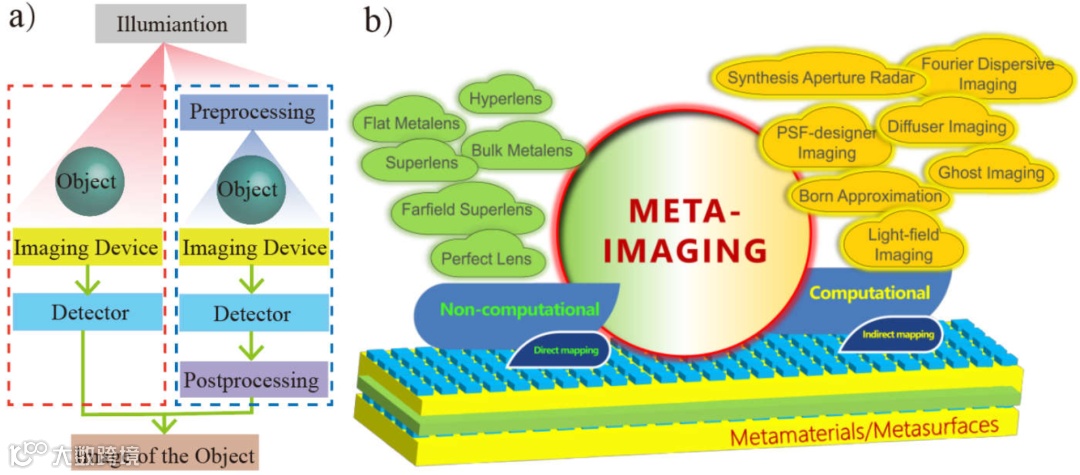 图1. 非计算成像和计算成像。a) 非计算成像(红色虚线框)和计算成像(蓝色虚线框)对比图;b) 超构成像一览图。