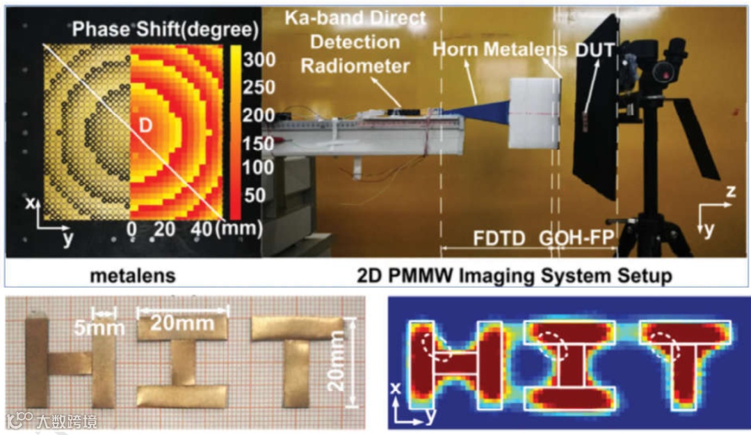 图2是作者所在课题组设计的基于平面超构透镜的被动毫米波(PMMW)成像系统。我们知道,所有物体都往外辐射电磁波,而不同物体的辐射特性一般不同。PMMW成像系统依照这一原理来实现被动接收物体的辐射,然后通过不同物体的辐射对比来实现成像。图2所示的PMMW成像系统工作于Ka波段,由辐射计、增益喇叭和一个平面超构透镜组成,具有较之于传统PMMW成像体统更小的体积和重量。