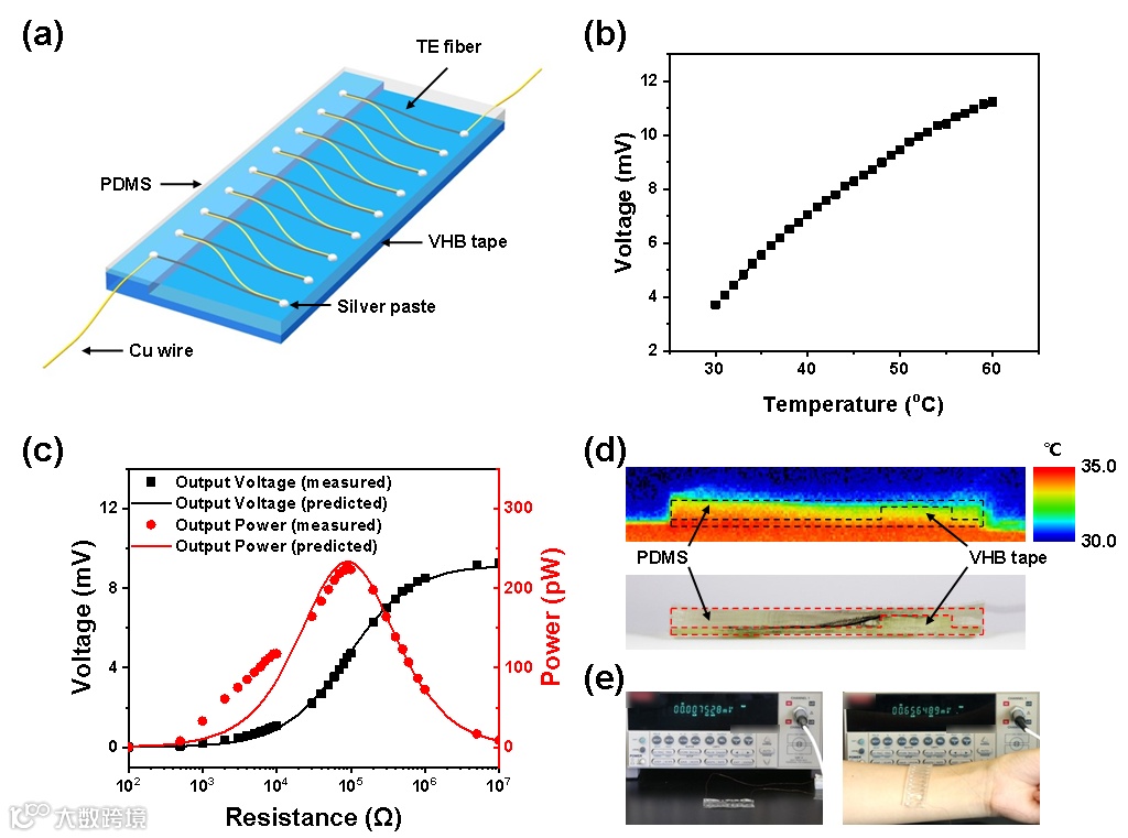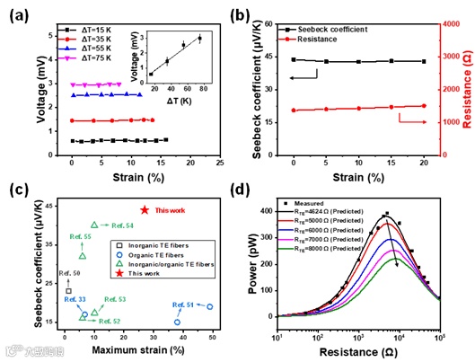 该团队通过实验证明其制备的热电纤维的开路电压不随拉伸应变的增加而变化,而是随温差的增加而增加。其纤维随着拉伸应变的增加,塞贝克系数几乎不变,热电纤维的电阻略有增加。通过和文献中的热电纤维相对比,该团队制备的纤维可以在保证足够拉伸性的同时有着较大的塞贝克系数。此外,该团队测试了在温差为50K条件下,外部负载不同电阻时测量纤维输出电压。而其输出电压随外部负载电阻的增大而增加,输出功率首先随着外部负载电阻的增大而增加,然后减小,并且最大输出功率约为394 pW。该团队还通过公式估算了输出功率,测得的输出功率(正方形)与预测值(线)一致。而其纤维在拉伸引起的电阻变化较小,证明了任何人体运动状态下其热电纤维都能实现稳定的信号输出。