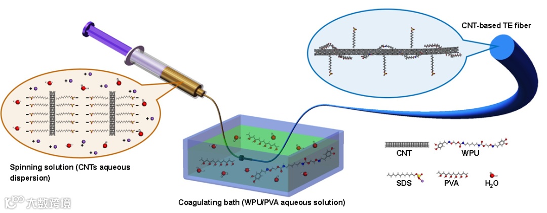 该团队通过湿法纺丝的方法,将羧基化碳纳米管和聚乙烯醇、水溶性聚氨酯结合,制备了可拉伸的热电纤维。其塞贝克系数达到了44.0μV/ K,与传统湿纺工艺不同,纺丝溶液的溶剂进入凝固浴中,而凝固浴中的WPU和PVA分子链反向渗透到相邻CNT之间的间隙中,从而使得碳纳米管和聚合物能够紧密的结合。
