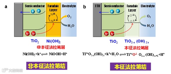 近日,南京大学固体微结构物理国家重点实验室、现代工学院、物理学院的罗文俊副教授/邹志刚院士团队以半导体/Ni(OH)2异质结为模型,研究了界面电荷传输机理,发现其具有可逆的界面电荷传输行为以及法拉体氧化还原电位窗口依赖于半导体能带位置等新特性,与传统半导体结的界面电荷传输行为完全不同。基于上述发现,该团队在国际上首次提出了法拉第结的新概念。为了加深对法拉第结的认识,该团队进一步研究了半导体/溶液界面电荷传输行为(Chem. Sci. 2020, 11, 6297, https://doi.org/10.1039/d0sc01052a)。通过改变半导体表面羟基含量,研究其对光电化学性能的影响,发现了表面羟基层起到固液界面电荷传输媒介的作用。增加表面羟基含量可以提高界面电荷收集效率,同时加快催化反应速度。因此,半导体表面羟基层与Ni(OH)2等非本征法拉第层具有相同的作用(图2)。为此,该团队提出了本征法拉第层的新概念,半导体/电解液结也可以认为是本征法拉第结。
