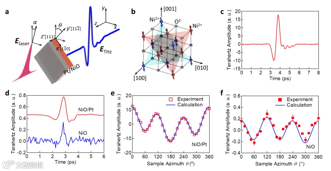 图1,a,NiO/Pt结构的太赫兹发射谱测量示意图;b,反铁磁NiO的自旋取向排列示意图;c,典型的NiO/Pt异质结结构的太赫兹发射谱信号;d,NiO/Pt结构与单纯的NiO薄膜的太赫兹发射谱强度对照;NiO/Pt结构(e)与NiO薄膜(f)的太赫兹发射幅值对其样品旋转角度的依赖性。