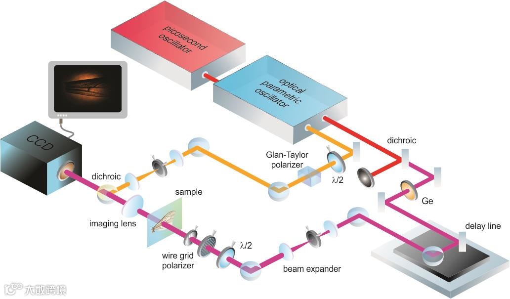 认识到硅基相机的优越特点,目前已经开发了一些策略,旨在将信息从中红外范围转换为可见/近红外范围,从而实现用硅基探测器间接捕获中红外特征。最近的一项进展是在样品后放置一个非线性光学晶体,通过和频产生的过程,利用附加的泵浦光对中红外辐射进行上转换。但其缺点是在非线性介质中需要中红外辐射与泵浦光束满足相位匹配。这个要求意味着要旋转晶体,以实现捕获单一图像所需的多个投影,以及对每一测量帧进行后处理,从而进行图像重建。