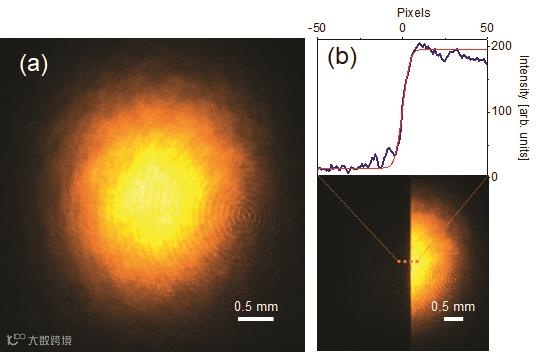 图3(a)使用1478纳米泵浦脉冲的中红外光束剖面图 (b)刀片覆盖一半的中红外区域(上面是横截面图)
