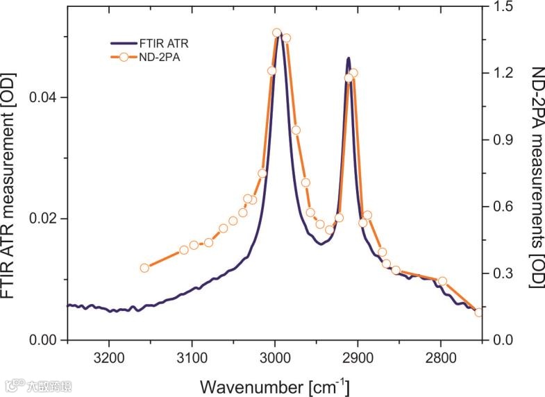 图2 利用非简并双光子检测器测量二甲亚砜的吸收光谱传输的中红外辐射