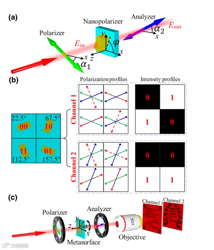 二进制图像在诸如书,文档,条形码和快速响应(QR)代码印刷品,微电子学中的光掩模等信息传输介质中起着重要作用。例如,采用由二进制图案组成的光掩模将设计的版图传输到半导体中集成电路过程中的材料。由于近来许多智能可穿戴设备(例如智能手表,智能服装,运动和健康检测设备以及虚拟现实(VR)和增强现实(AR)眼镜)都朝着多功能化和长续航能力发展,因此具有纳米级分辨率的光掩模非常受关注,希望使集成电路小型化。另外,一些用于防伪或加密的二进制图像打印件还满足超紧凑,易制造,高存储密度,良好的质量和先进的安全性以供进一步开发的紧迫要求。超表面是有希望的候选来构造灰度图像来面对这些挑战和要求。