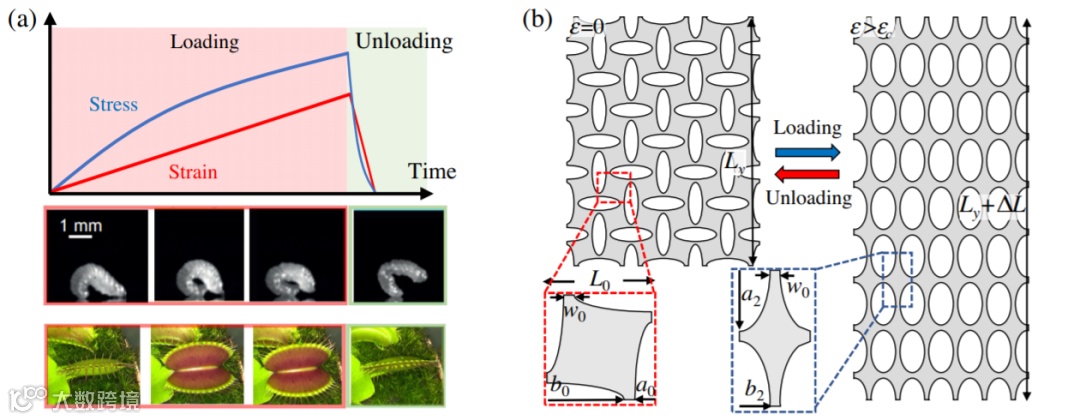 在生物系统中普遍采用脉冲变形来规避力与速度的权衡,并超过肌肉的力量极限。在这些系统中,生物将弹性能量存储在用作弹簧的组件中,然后在触发的后坐事件中释放该能量。例如,螳螂虾通过释放储存在外骨骼中的弹性能来驱动其附肢的快速运动(峰值速度为20m / s),无腿的幼体通过迅速释放弹性能量而缓慢跳跃,其跳跃体长是其体长的28倍。内部加压过程中,维纳斯捕蝇器将弹性能量的缓慢液压存储与捕捉飞行昆虫的快速不稳定相结合。这种生物系统中的脉冲形变是由装卸过程中的不对称引起的,在其中,弹性能量通过准静态条件存储,并通过快速,动态的后坐力迅速释放。这些自然的运动是通过材料特性和结构进行内在控制的。从射箭弓到抗体驱动的DNA纳米机,工程系统中已采用了类似的方法。但是,对于弹性反冲结构,仍然难以系统了解结构与材料特性的相互作用。