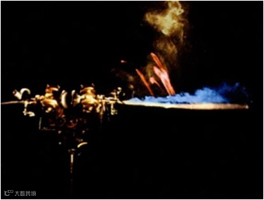昆虫是地球上最早能够飞行的动物,并且已演化出超过100万种能够飞行的昆虫[2]。昆虫具有极强的飞行能力,可以悬停甚至倒退飞行,因此昆虫飞行吸引了不同领域的学者们的关注。但学者们发现昆虫在实际飞行中所产生的升力要远高于理论估测,为此许多学者对昆虫的飞行展开了研究。其中,Ellington等人在1996年建立了昆虫的机械模型,通过烟雾首次在昆虫飞行中发现稳定附着的前缘涡(Leading-edge vortex, 如下图中蓝色区域),并提出了前缘涡机制[3]。