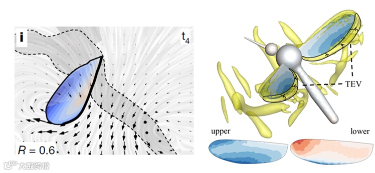 清华大学航天航空学院黄伟希副教授与博士生张钧铎对蚊子飞行时翅膀经过的区域进行划分,并定量分析了前缘涡与后缘涡对蚊子升力的贡献。