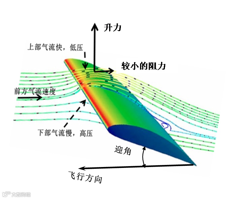 那么,飞行中的机翼为何能产生升力呢?这需要站在地面看飞机才能理解。原来,飞机的机翼设计成了这样的形状和姿态,在发动机推力推动飞行的过程中,机翼的前端(前缘)相比于尾端(尾缘)抬起了一个适当的角度,这个角度在专业上称为迎角。