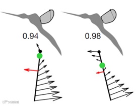 他们发现尽管前缘涡对升力有一定贡献,但只维持了很短的时间,而后缘涡则对升力提供了主要的贡献。蚊子升力的第一个峰值在翅膀刚开始向下拍动并向内旋转时由附着的后缘涡提供;而第二个升力峰值是在拍动中期的旋转阶段带动后缘涡的对流作用贡献的;第三个升力峰值则是在翅膀向上拍动过程中前缘涡所贡献的。从整个扇翅周期来看,后缘涡对升力的贡献占据主导地位[9]。